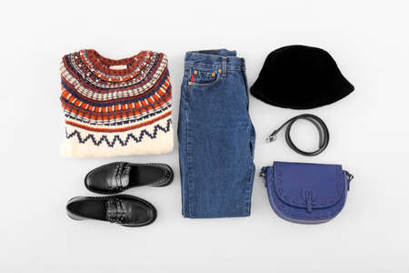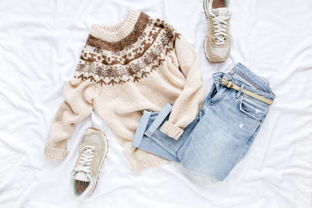 Female fashion look with stylish clothes and accessories. Womens warm sweater, jeans, sneakers. Modern and casual outfit. Flat lay, top view.