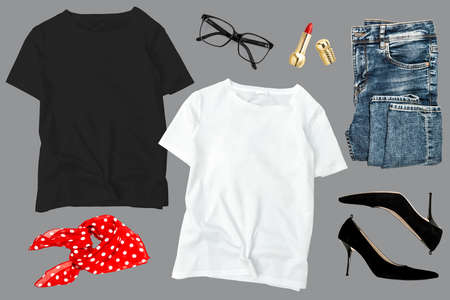 Casual clothes jeans, t-shirt, shoes. Fashion flat lay for website, social media