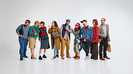 Group of people, men and women wearing stylish autumn outfits, waiting for seasonal sales. Ready to grab the best discounts