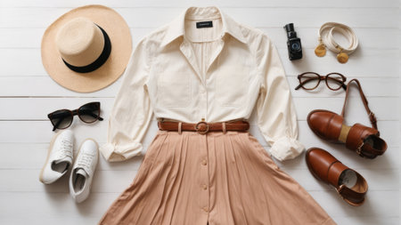 summer flat lay of fashion women outfit on beige background top view, vacation on sea concept