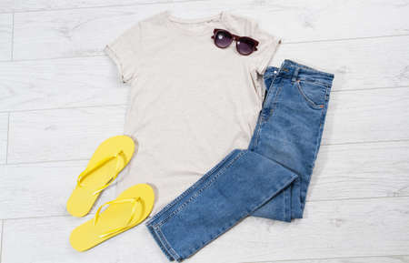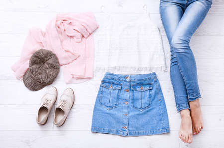 Casual summer outfit with different accessories and female legs in jeans on white wooden floor. top view