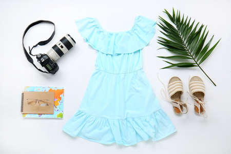 Stylish female clothes with photo camera, map and notebook on white background. Travel concept