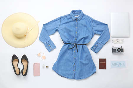 Stylish female clothes with accessories, photo camera, laptop, mobile phone, passport and ticket on white background. Travel concept