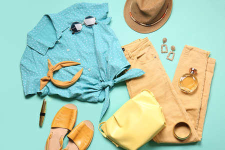 Female clothes, shoes and accessories on color background