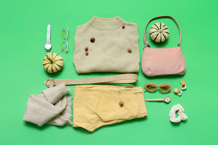 Stylish female clothes and accessories on green background