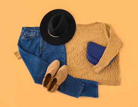 Stylish clothes and shoes on color background