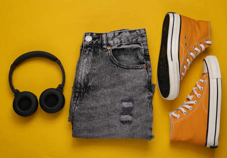 Gumshoes, jeans and headphones on a yellow background. Women's clothing and accessories. Urban style, travel concept. top view