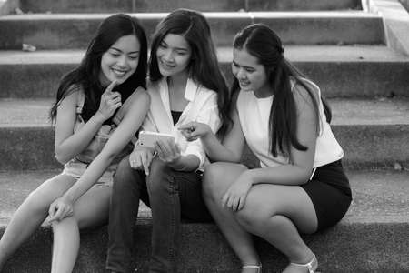 Three young Asian women as friends using phone together at the park in black and white