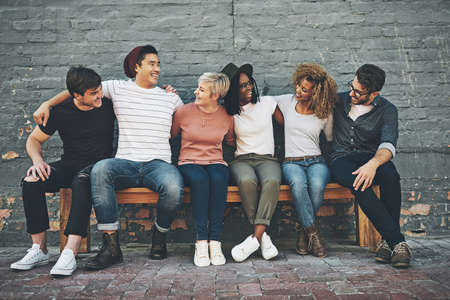 The bench of perpetual friendship. Shot of a diverse group of people chilling together outside.