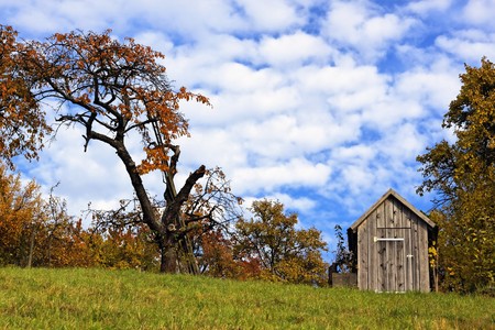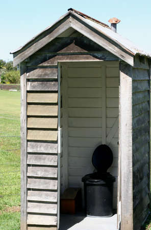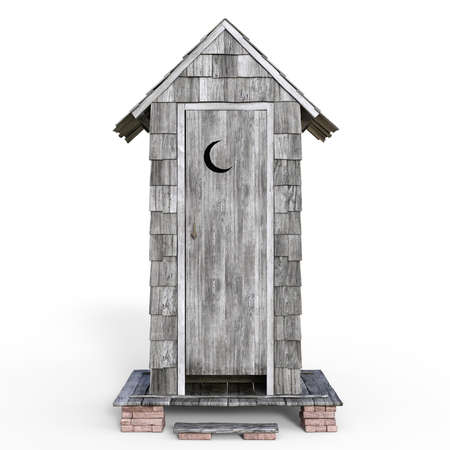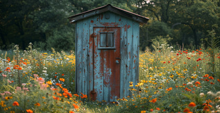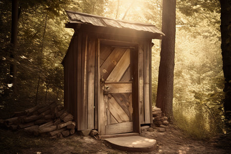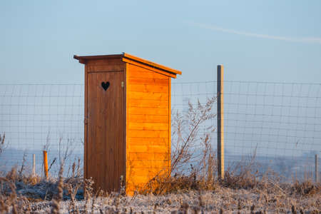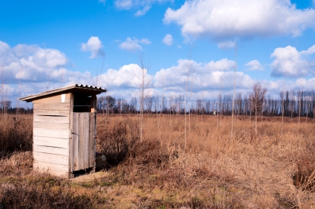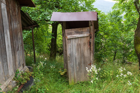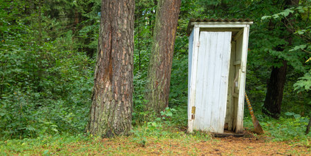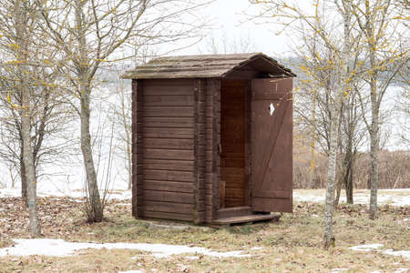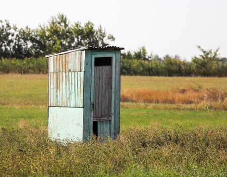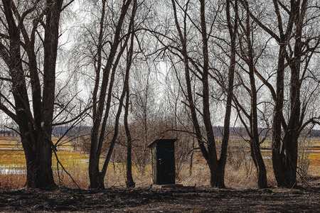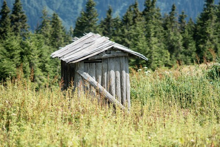 An old wooden latrine in a meadow in the countryside, surrounded by forest. Rural landscape.