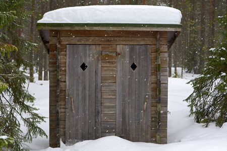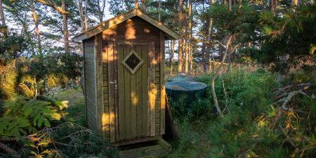 Eco-friendly wooden Compost toilet cabin in the Finnish forest, promoting protection of nature, sustainable tourism, and respect for the fragile northern environment