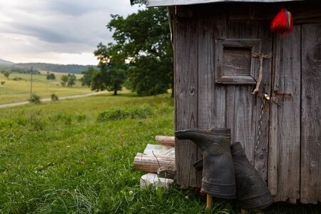 Country dacha. Moody old rustic farm house. Authentic wooden shed