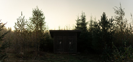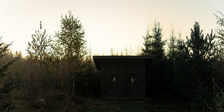 Weathered wooden outhouse stands amid evergreen and deciduous trees under a soft pastel morning sky, creating a tranquil scene deep within untouched Nordic nature. Captured in Finland, Europe.