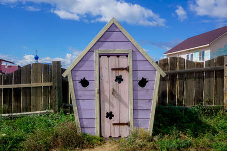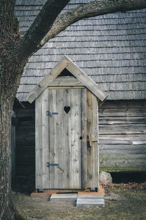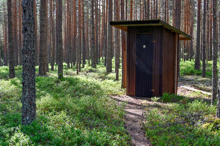 A wooden building of a toilet or toilet in a remote forest in a National Park in Russia on the Curonian Spit. The concept of recreation.