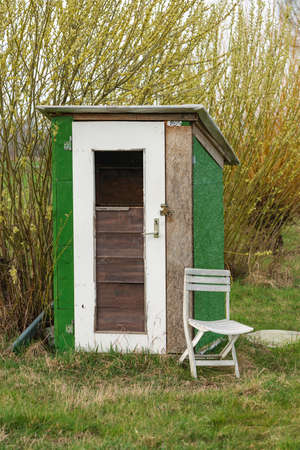 Wooden toilet in the forest. Toilet with a white closed door near trees on green grass.