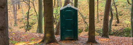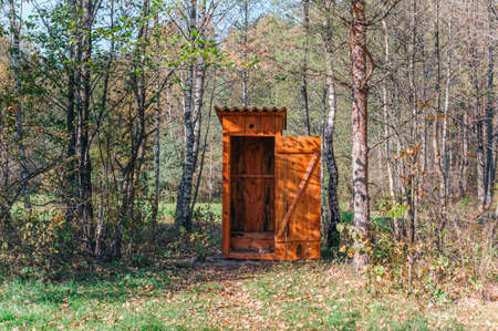 Opened wooden WC toilet cabin in a golden forest national park, close-up. Autumn landscape. Seasons, ecology, ecotourism, environmental conservation, architecture