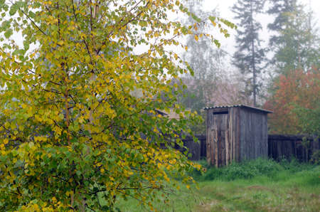 A wooden toilet stands in the autumn at the end of the residential area behind the yellow leaves of birches in the North of Yakutia in the fog.