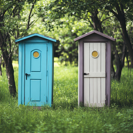 Two distinct restrooms stand side by side in a lush park surrounded by vibrant greenery and trees in bright daylight.