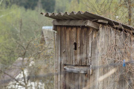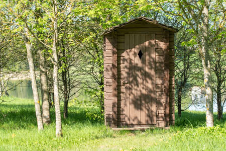 Old wooden toilet on the edge of the forest on the background of green trees in grass