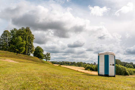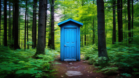 Wooden toilet in the forest. Blue colored natural bio WC cabin among trees on green grass. Finland