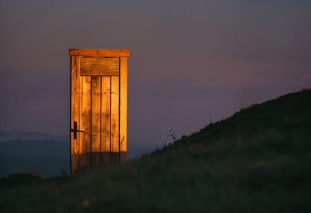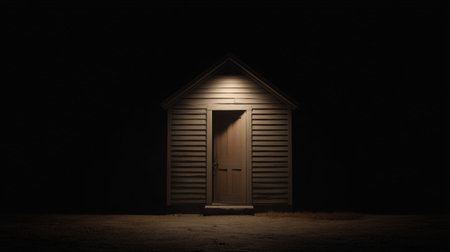 A wooden cabin stands alone in the darkness, with only a single door illuminated. This striking image creates an atmosphere of mystery, intrigue, and solitude.