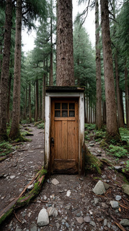 A mysterious wooden door stands alone in dense forest, inviting curiosity
