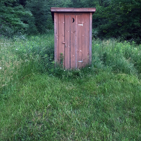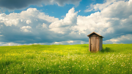 Aged wooden outhouse with creaky door amidst a grassy field under heavy cloudy skies, evoking quiet rustic simplicity and timeworn beauty