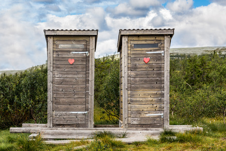 Two wooden outhouse toilets with red heart in mountain landscape.