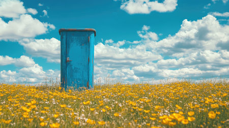 A solitary toilet painted in vivid blue, standing in an empty field of yellow flowers under a bright sunny sky.