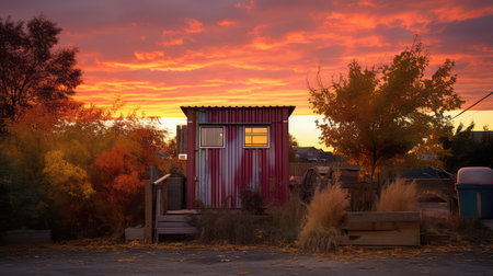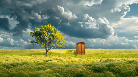 A tranquil scene showcasing a vibrant tree next to a rustic wooden shed, set against a dramatic sky filled with clouds, illuminating the lush green field.