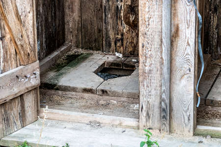 Dirty wooden toilet at a construction site. Unsanitary conditions. Latrine