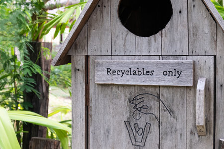 Wood garbage bin with sign and logo that this bin will use for recyclables trash only. With nature and green trees blurred at the background. Environment conservation, trash reuse and recycle concept.