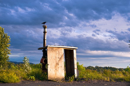 Remnants of the former building of the wooden wall with a doorway and the roof over which a metal pipe sticking out from the old communication with valve flap in the middle. Crow sitting on the tube, as a symbol of change and ending on the former prosperi