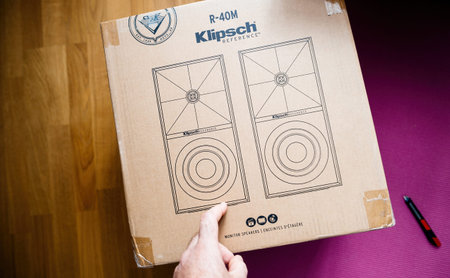 Paris, France - Apr 18, 2023: The Klipsch R-40M speaker box showcasing a technical sketch of the product design with branding elements, set against a wooden floor - male hand preparing for unboxing