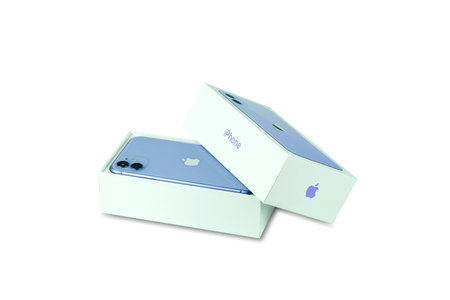 Bangkok - January 16, 2022 : Box with Apple USB-C 20W Power Adapter and USB-C type to Lightning fast charging cable. Close up