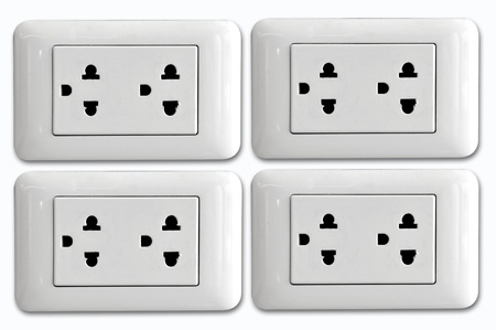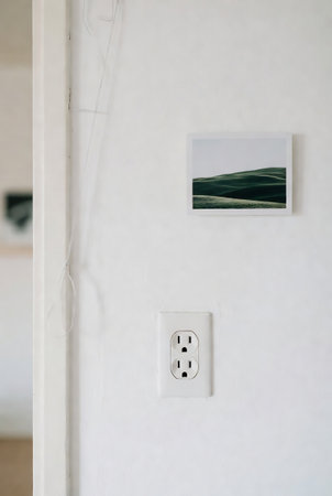 Power Outlet Wall. A simple, minimalist shot of a white studio wall with a single, multi-socket power outlet. A black