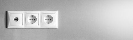 electrical outlets, set of three white empty electrical sockets and antenna socket for TV with light shadow on empty grey background, electrical point of power in house, closeup, minimalism concept, banner with copy space