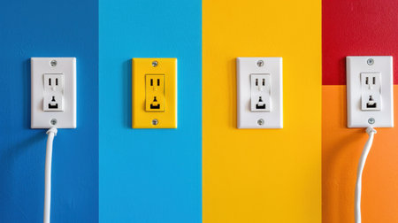 A stylish depiction of colorful electrical outlets set against vibrant wall paints, showcasing modern interior design and practical home aesthetics.