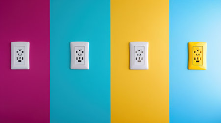 A visually striking image showcasing electric outlets placed on vibrant colored walls, including shades of purple, blue, yellow, and teal, ideal for home design.