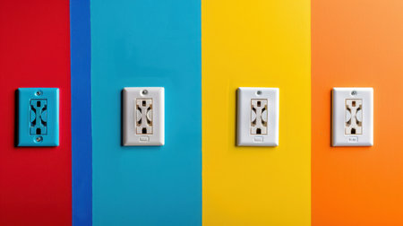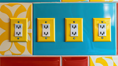 A vibrant and colorful wall featuring electric outlets in contrasting shades, ideal for modern interior design projects and creative spaces.