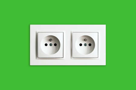 Brand new electrical socket isolated on green wall. Renovated studio apartment power supply background. Empty copy space double white plastic power outlet. Be eco and save energy.