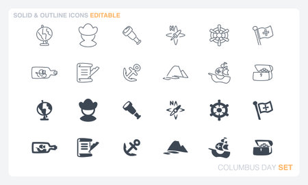 The vector file includes Columbus Day icons in both solid and outline styles and is fully editable.