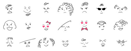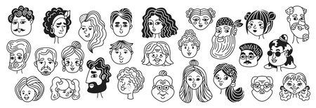 Human Avatars Collection. Faces of people. Characters set. Happy emotions. Portrait for social media, website. Men and women, grandparents and girls. Hand drawn doodle sketch.