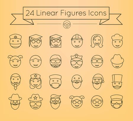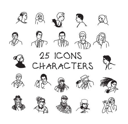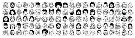Faces people different avatars doodle hand drawn icon set. Outline drawing head people line clipart symbol collection