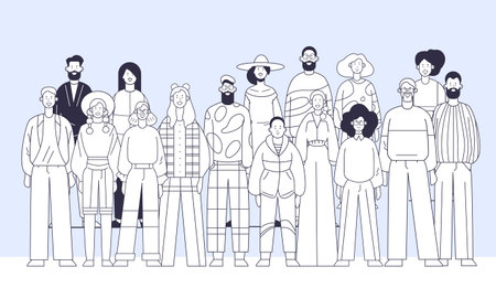 Diverse group of people standing together minimalistic line art style various outfits and hairstyles modern fashion community concept
