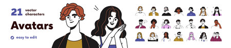Happy young people avatars with thinking face expressions set. Line character heads, thoughtful men and women. Smiling girls and guys portraits. Flat vector illustrations isolated on white background