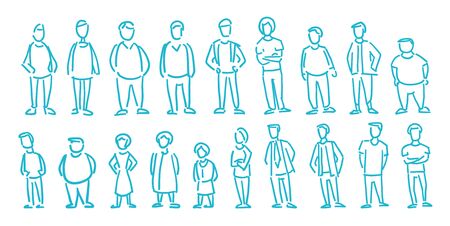 People set. Hand drawn sketch. Ordinary people. Contour blue line vector.