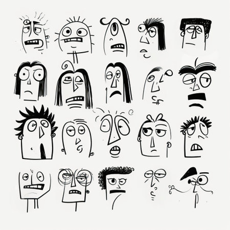 Collection of cartoon faces in black and white. Various expressions and hairstyles. Each illustration styles represents different emotions and showcasing diversity.