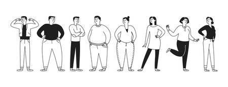 Set of diversity people, men and women with perfect body together with cute fat people. Vector doodle illustration isolated on white background