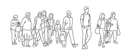 One line drawing of urban residents walking on city street. Group of different people walking city background. Casual townspeople crosses the road in one way hand drawn vector illustration